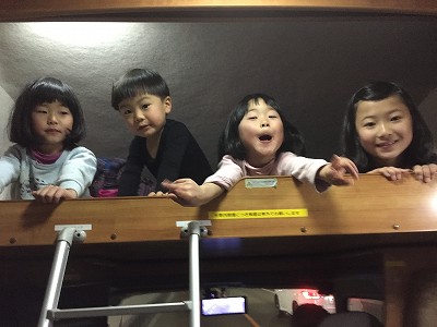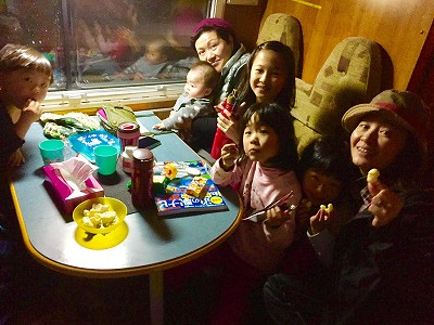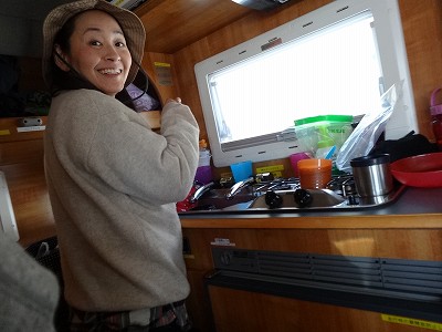 夜は、5人がキャンピングカーで寝袋で寝ました。