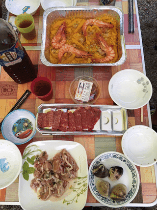 パエリアとBBQ、釣り堀で釣ったアユの塩焼き、〆はもちろんサモアと子供達共々食い倒れ・・・。