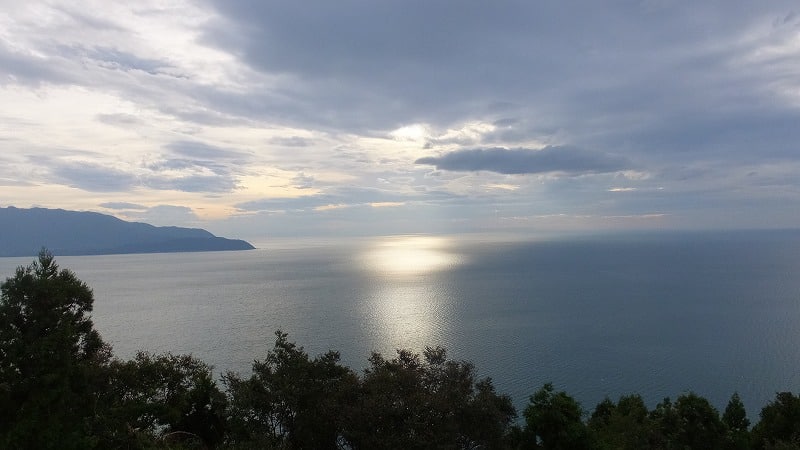 夕方のきれいな海を見て、キツネうどんを食べる。まだ17時、道の駅越前(約50km先)へ向かう。海沿いをゆっくり走って気持ちいい。