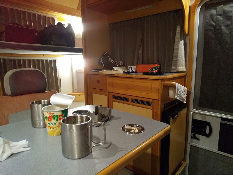 ようやく到着して車両設置。オーニングがとても快適で食事も弾みます。RVパークで電源が取れるので夜は社内でTV見ながら、まったりとお酒を楽しみました。バンクベッドも快適で全く不自由を感じず朝までぐっすり眠れました。