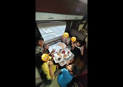 従兄弟たちと一緒にキャンピングカーの中でピザを食べました。中はとても広いので多人数でも食べることができました。